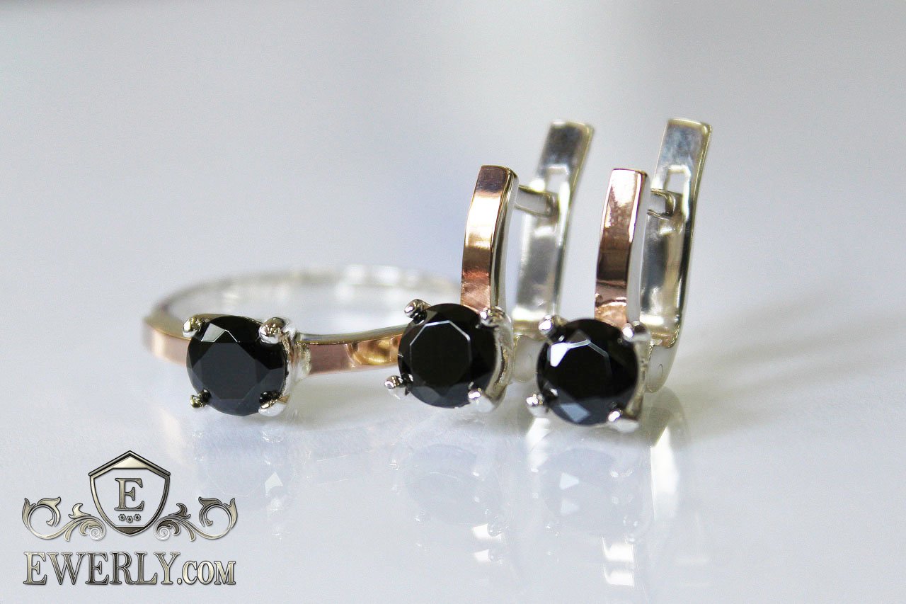 Серебряные серёжки и кольцо с золотом и чёрными камнями для девушек