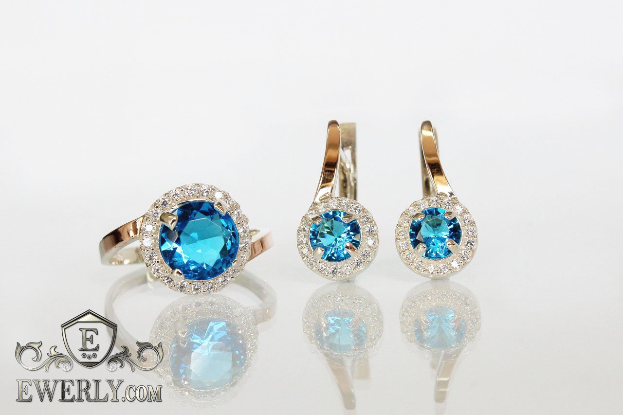 Женские серебряное кольцо и серьги с золотыми вставками и камнями - голубыми фианитами.