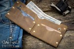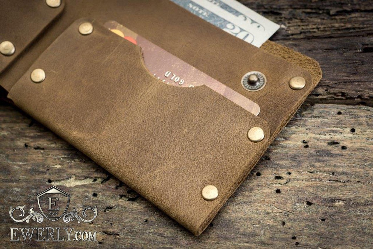 Кожаный бумажник имеет одно отделение под купюры всех номиналов и два отделения для банковских карт / визиток. Всего вмещается 4-6 карт в зависимости от их толщины, закрывается кошелёк с помощью двух кнопок изнутри.