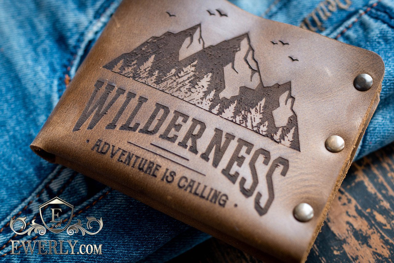 Полностью выполнен из натуральной кожи и металлических заклепок. Эксклюзивное изделие ручной работы, имеет эффект потёртости и лёгкой небрежности с изображением гор и надписью: "WILDERNESS adventure is calling", что на русском звучит как "ДИКАЯ МЕСТНОСТЬ приключение зовёт". Рисунок нанесён на кожу с помощью лазера (лазерная гравировка). Изготовлен в ограниченном выпуске.