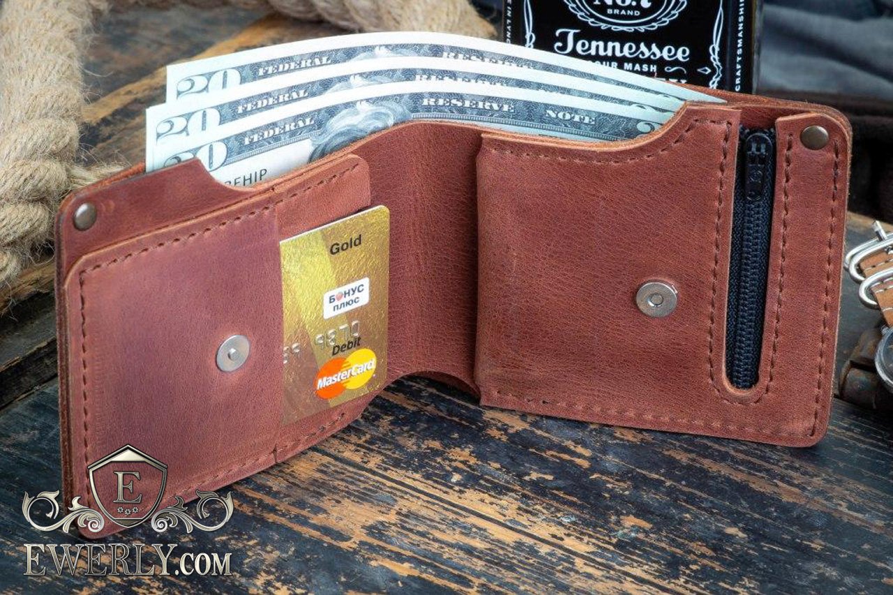 Данная модель кошелька изготовлена из натуральной винтажной кожи коньячного (красно-коричневого) цвета, на которой могут оставаться естественные царапины и потёртости. Любая такая царапина легко затирается рукой. Компактный и является весьма стильным мужским кошельком с интересным дизайном. Имеет один раздел под банковские карты, один раздел с молнией под мелочь, а также один раздел под бумажные деньги купюрами любых номиналов, в том числе самых крупных.