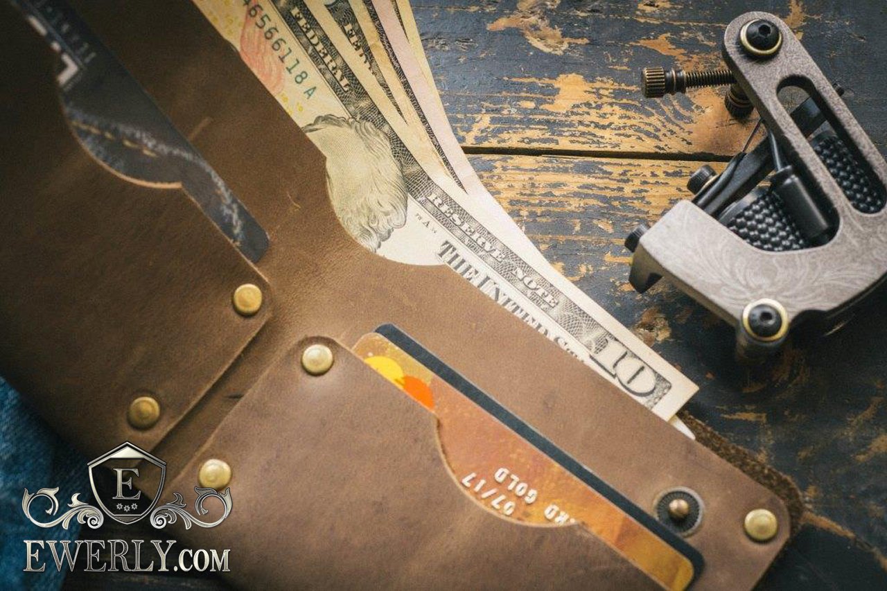 Бумажник имеет одно отделение под купюры всех номиналов и два отделения для банковских карт / визиток. Всего вмещается 4-6 карт в зависимости от их толщины, закрывается кошелёк с помощью двух кнопок изнутри.