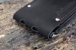 Зажим выполнен из натуральной кожи и является полностью ручной работой. Состоит из двух отделений, две стороны одного из которых изнутри скреплены кнопками. Внутри есть кармашек для мелочи и два раздела для банковских карт. Отделение для бумажных денег вмещает в себя купюры всех номиналов.