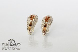 Женские серебряные серьги в виде капли, серебро 925 пробы с золотом 375 пробы и красными камнями - фианитами (гранатовый цвет).